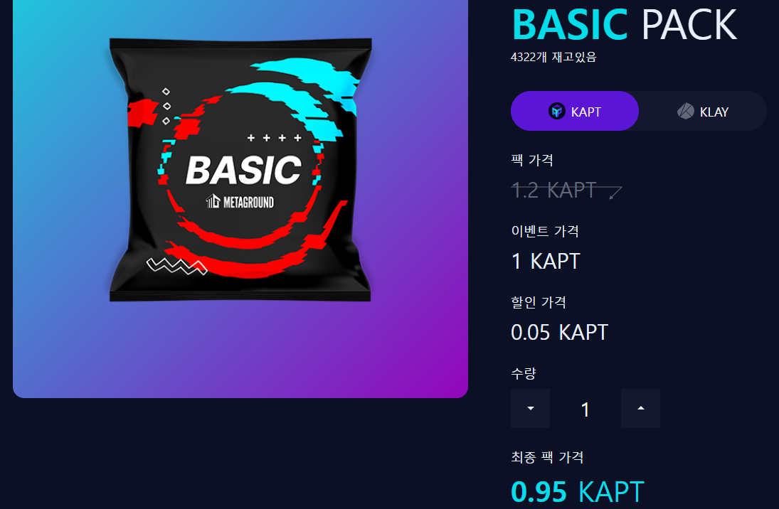 무료로 받은 1 kapt로는 현재 베이직 팩을 살 수 있습니다. 원래 1.2 KAPT이지만 정식오픈전 할인이벤트로 1KAPT입니다.