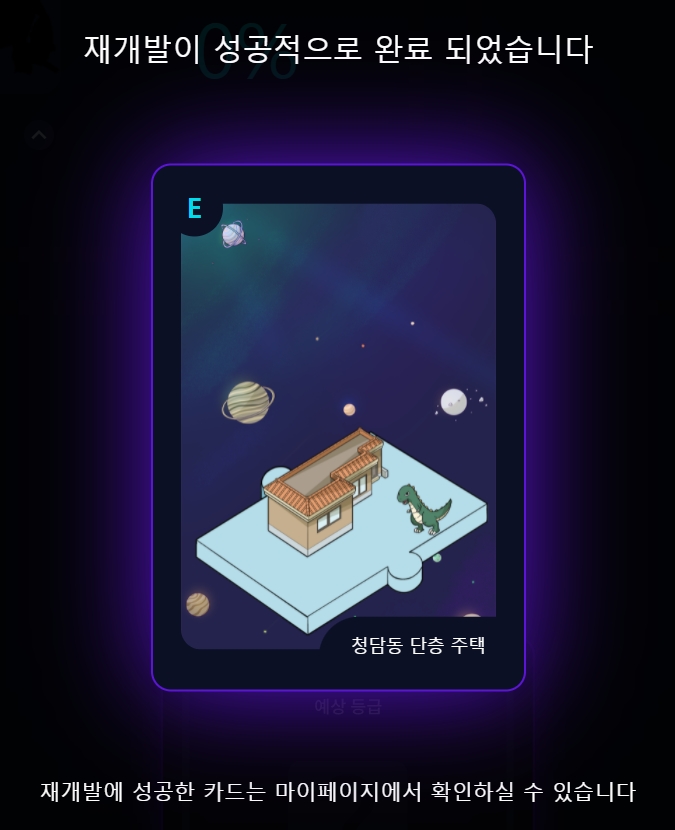 오옷! 아트배경에다가 희귀요소인 공룡이 붙었습니다!! E등급 카드이니까 4.5%의 추가 확률이 붙었네요. 만약 F 등급카드였다면 8%에 해당하는 재개발 성공 보너스 확률짜리입니다. 이런건 나중에 마켓플레이스 열려서 NFT 거래가 되면 같은 등급중에서도 더비싸게 팔릴거 같습니다.