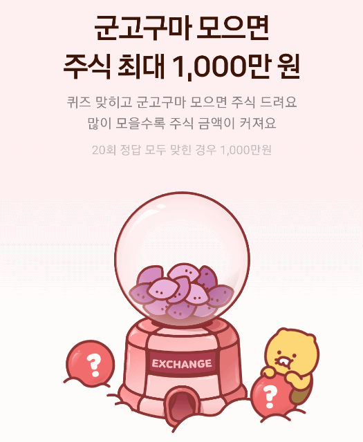 * 이벤트 종료 후 발급된 고구마는 주식과 교환할 수 있습니다. 보유한 고구마 갯수에 비례하여 랜덤주식으로 지급됩니다.