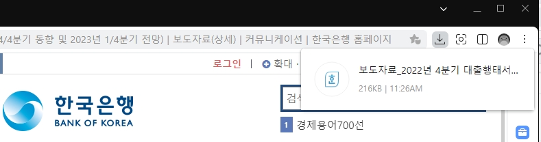 그럼 '열기' 말고 '저장'을 누르면 비슷하게 작동할꺼라 봤는데 이런식으로 우측 상단에 표시된 파일이름을 눌러도 네이버 웨일은 역시나 내장 문서 뷰어로 열어버립니다.
