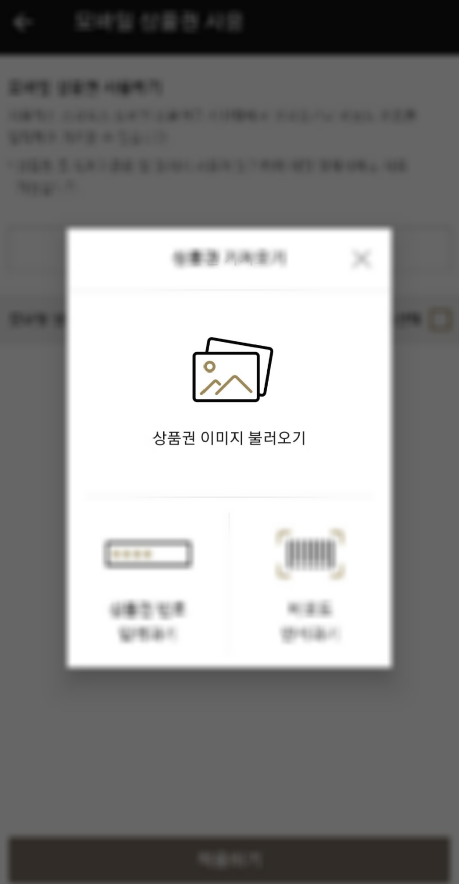 + 상품권 가져오기를 눌러서 MMS, 카톡 등으로 받은 기프티콘 이미지를 갤러리에서 가져올 수 있다.