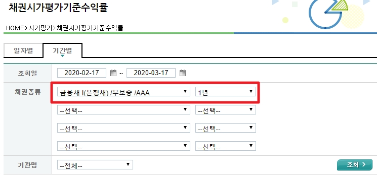 해당 사이트 상단메뉴중 시가평가로 들어가서 채권시가평가기준수익률을 선택합니다. 여기서 다시 기간별을 선택하구요. 금융채 I(은행채)/무보증 /AAA을 선택합니다. 아래 그림처럼요. 그리고 하단에 기관명에는 민평평균을 선택합니다.