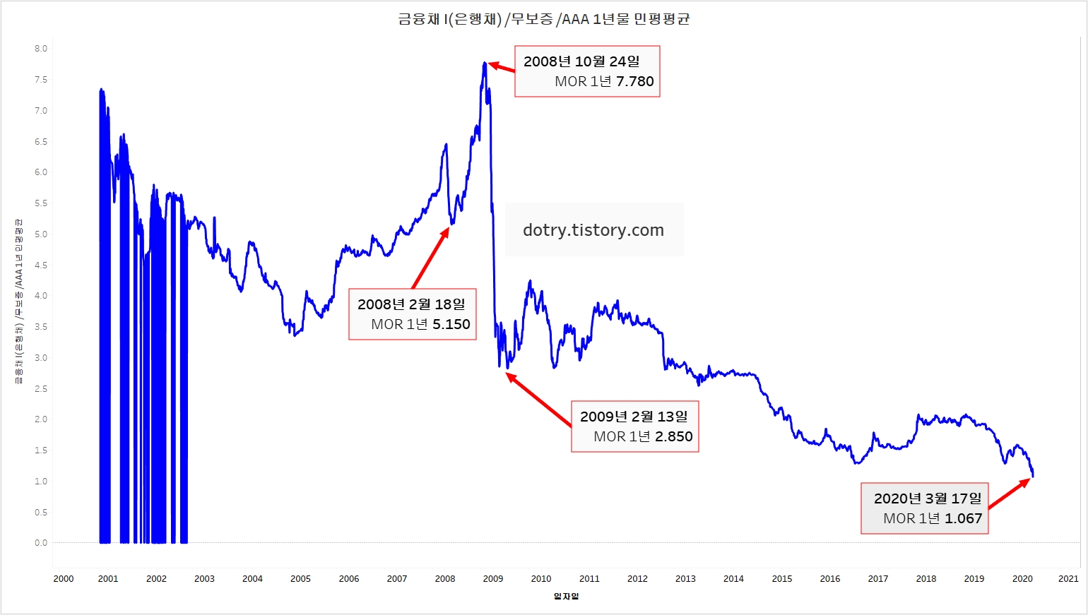 약 20년간 MOR 금리 추이입니다.