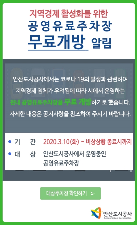 코로나19 확산과 관련하여 지역경제 침체가 우려됨에 따라 지역경제 활성화 및 시민편의 증대를 위하여 안산시에서 운영하는 관내 공영유료주차장을 무료 개방합니다.
