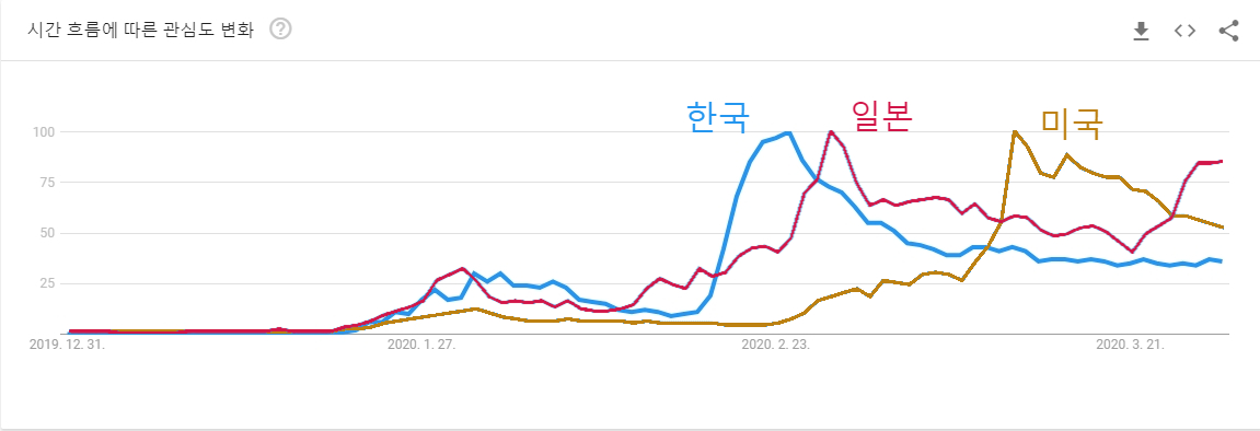 요즘 금융시장이 코로나 발생으로 인해 모든 것이 뒤틀린 터라 나라별로 코로나 관심도를 알아봤습니다. 기간은 지난 90일, 지역은 한국, 미국, 일본으로 설정했습니다.