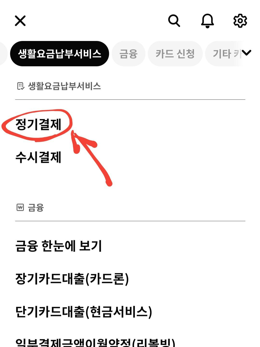 메뉴가 잔뜩 나옵니다. 거기서 쭉쭉 스크롤해서 아래와 같은 "정기결제" 라고 되어있는 메뉴를 찾아야 합니다. 찾으셨다면 당연하게도 터치해주시구요.
