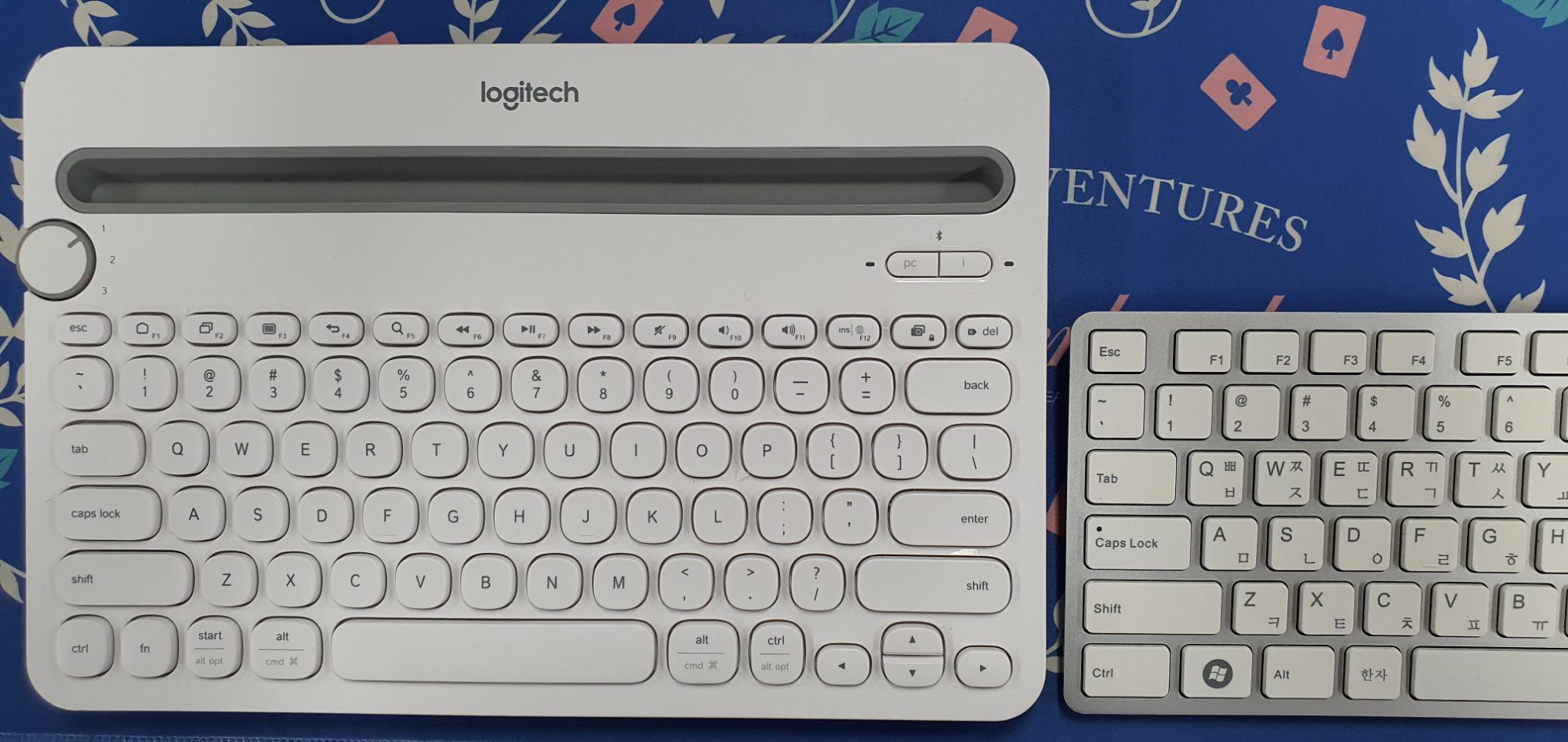 아래는 로지텍 k480인데요 보시다시피 우측 키패드와 화살표부분을 빼면 가로 사이즈는 같습니다. 저 길이 만큼 마우스를 멀리 잡지 않고 내 몸쪽으로 가까이 할 수 있다는 거죠. 키캡 하나하나의 크기는 풀사이즈 키보다와 동일한 크기입니다.