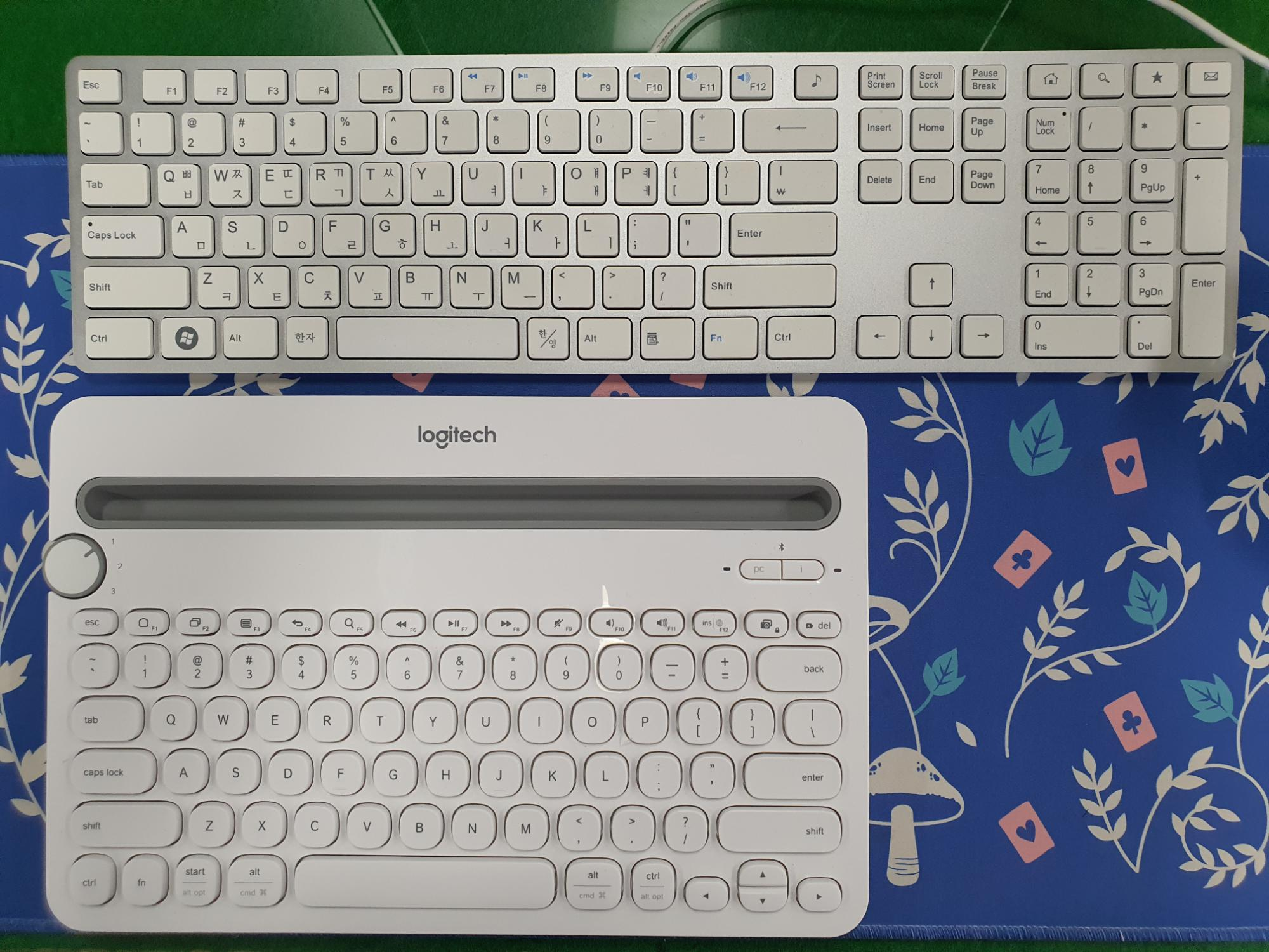 키보드 크기 부터 보자면 아래사진에서 위쪽 긴 화이트 키보드는 i-rocks kr-6402 유선 키보드입니다. 무선키보드 오류를 대비해서 안버리고 어쩌다가 한번씩 꺼내보는 키보드인데요. 보다시피 풀사이즈 키보드입니다.