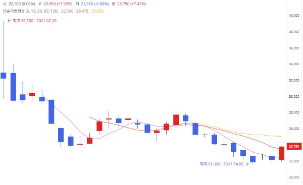 이후 매수후에도 최저 21,600원까지 떨어지는 아쉬움이 있긴했지만 오늘은 빨갛게 타오르는 중이다.