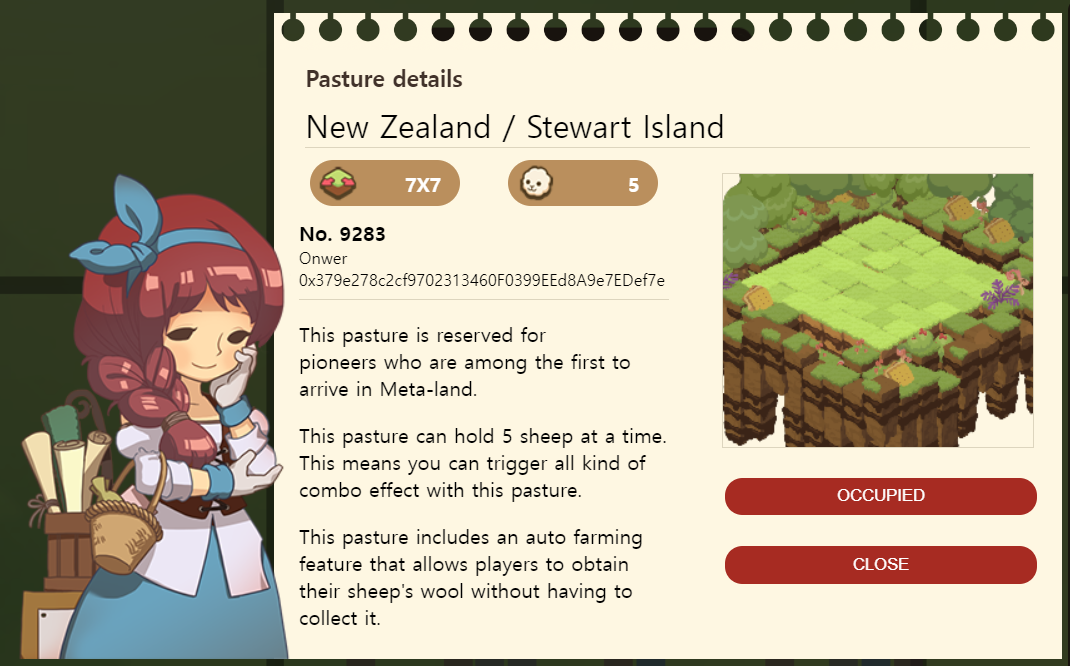 - Small Pasture (5x5, 3 sheep MAX) = 150 Klaytn