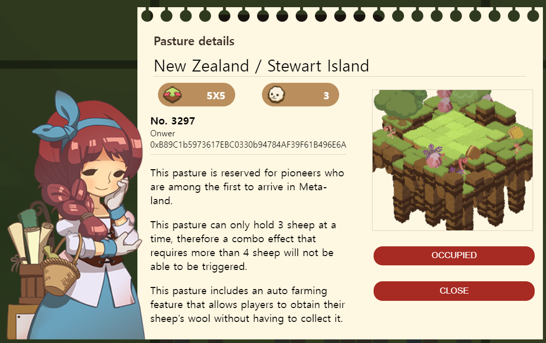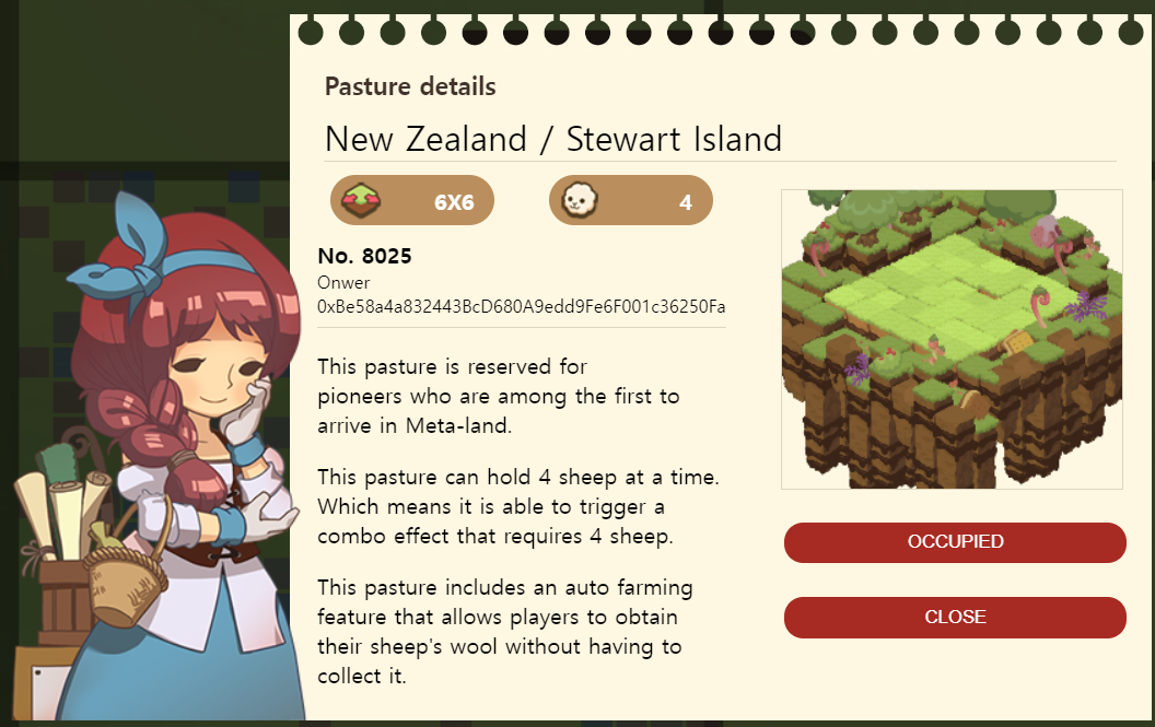 - Small Pasture (5x5, 3 sheep MAX) = 150 Klaytn