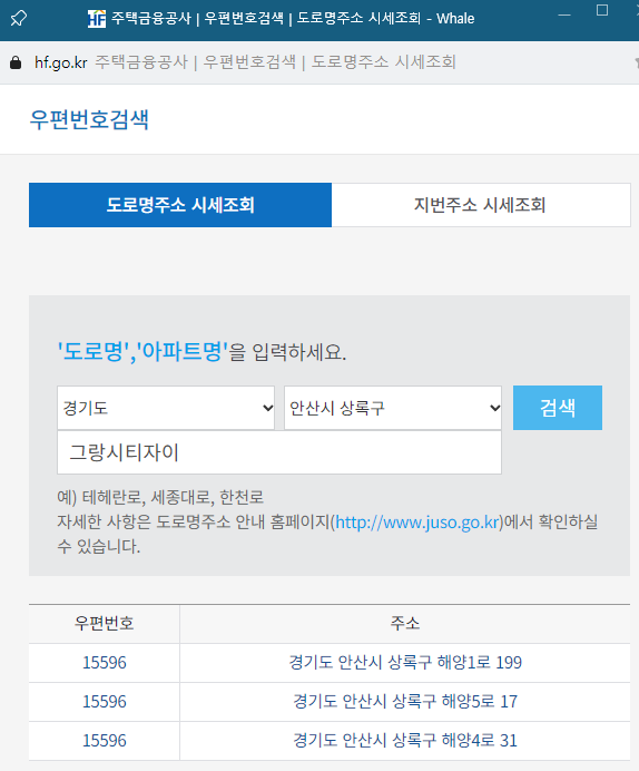 다시한번 주택금융공사의 도움을 받아보겠습니다. 사이트를 이리저리 돌아보다가 다시 찾았네요. 화면 구성은 아래처럼 되어있구요. 도로명주소나, 지번주소로 검색할 수 있습니다. 예전처럼 해당 지역만 선택하면 아파트 목록이 쫙 나오는 형식이 아니어서 약간 불편합니다.