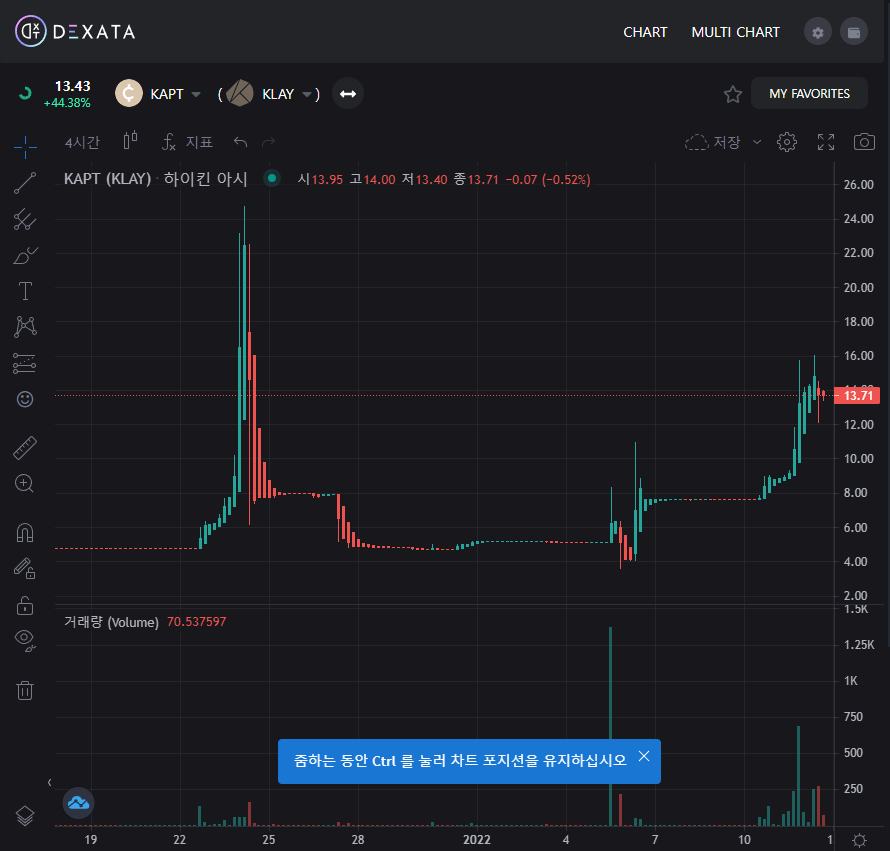 위 그래프는 기준을 클레이로 두었을때인데요. 글 작성시점에서 1 KAPT에 13.43클레이입니다.