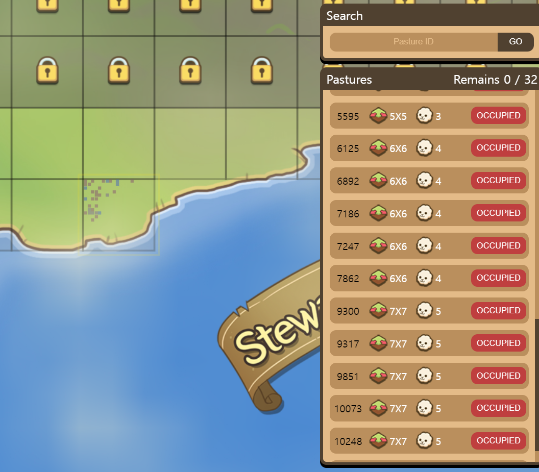2. Pastures 목록에서 5X5 , 6X6, 7X7 땅중에서 purchase라고 써있는 땅을 선택(OCCUPIED는 팔린거에요)