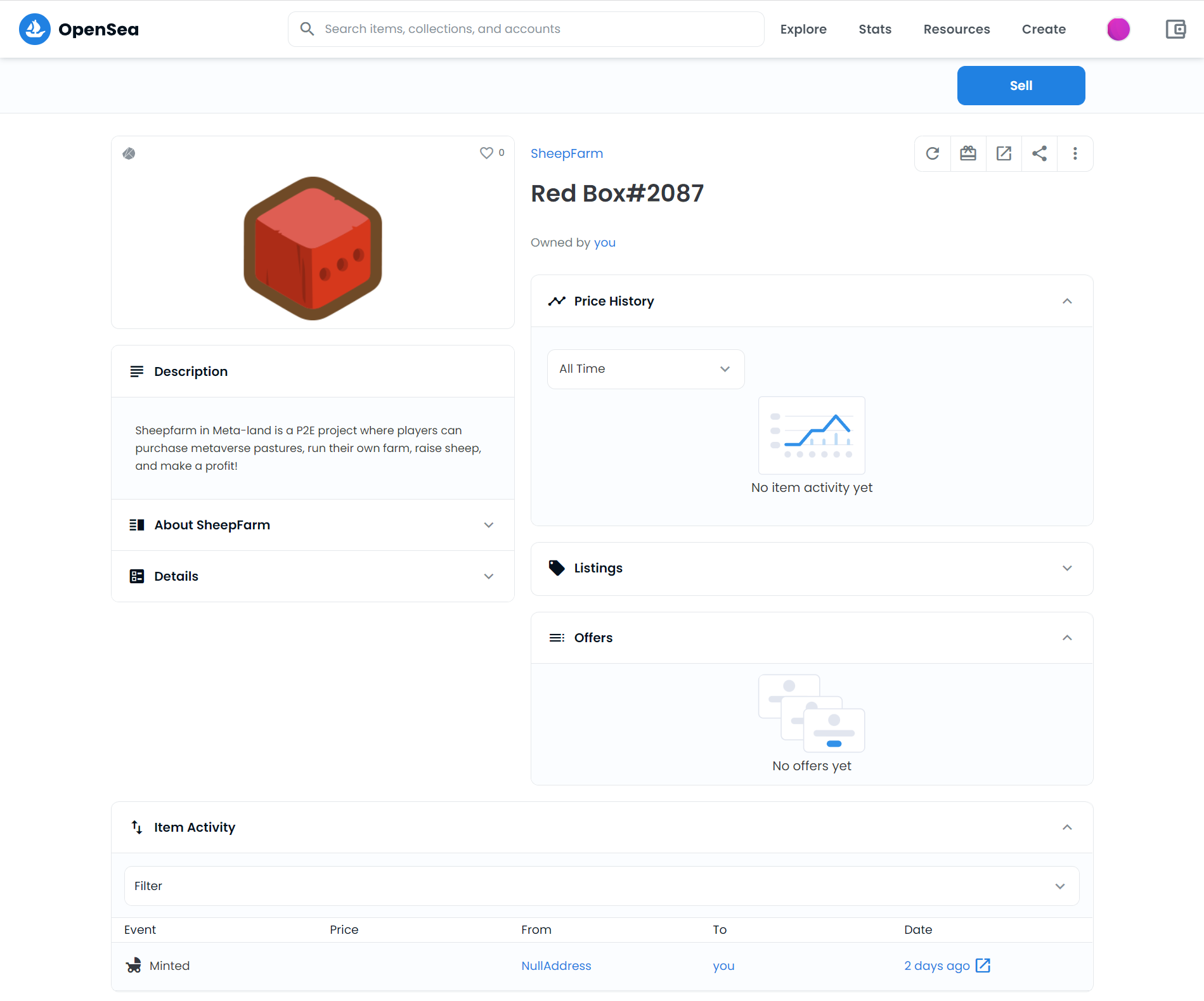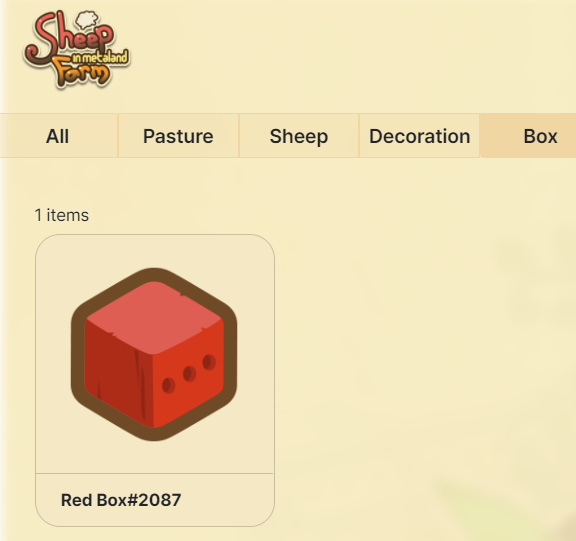 https://sheepfarm.io/inventory 여기로 접속해서 지갑연결을 하면 아래 그림처럼 빨간 박스가 들어와있습니다. 주차별로 빨주노초파남보의 7박스가 들어올건데요. 1주차라서 빨간 박스가 들어왔습니다.