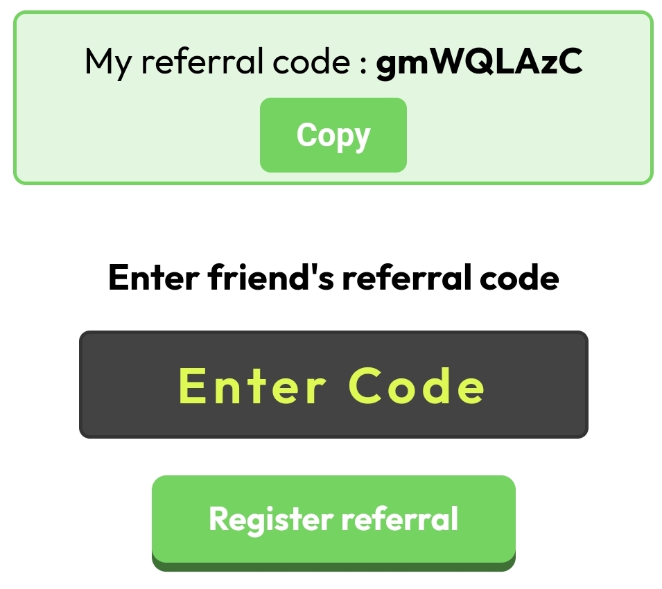 5. 페이지 이동하면 아래와 같은 화면이 보일건데요. 여기에 자신의 레퍼럴코드가 보이고 그 아래 Enter Code 라고 적혀있는 곳에