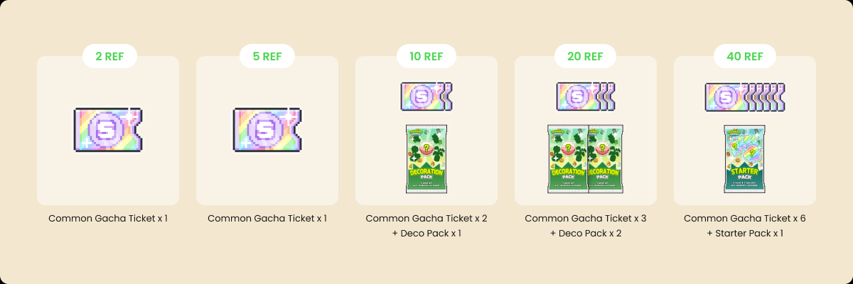 레퍼럴 2포인트부터 티켓을 받을수 있구요. 상위 점수를 달성하면 하위 보상까지 모조리 받는 구조네요. 예를 들어 10레퍼럴 포인트를 달성하면 가챠티켓 4개 데코팩 1개를 받을수 있어요.