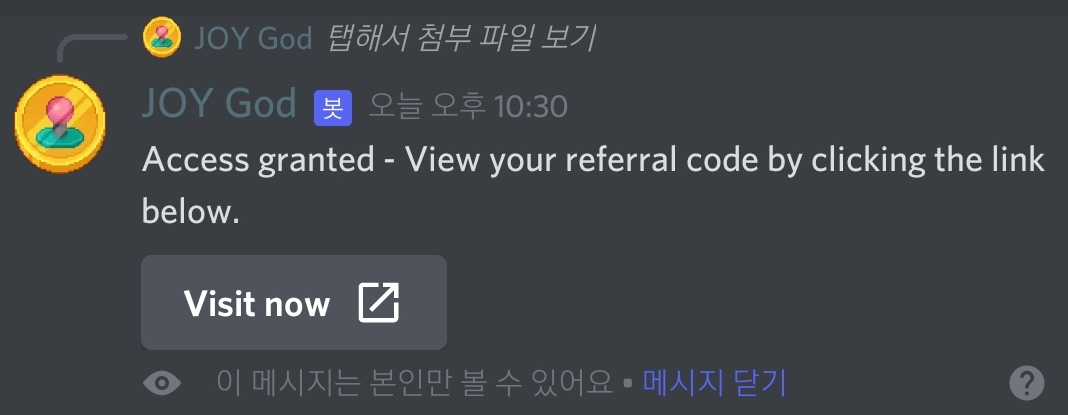 4. 카이카스 지갑을 연결하고 나면 엑세스 허용되고 레퍼럴코드를 확인하고 입력할수 있는 페이지로 이동하는 버튼(Visit now)이 생깁니다.(카이카스 지갑은 원래pc에서만 작동합니다. 편하게 pc에서 하세요. 그런데 모바일 키위 브라우저를 설치하시면 핸드폰에서도 가능하긴합니다만 불편해요.)