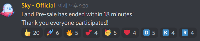 예상보다는 빠르게 종료되지 않았지만 그래도 이정도면 유망해보입니다. 더욱이 바로 땅 NFT를 구입할 수 있었던게 아니고 봇 방지 매커니즘이 실행 되었습니다. 봇만 제대로 걸러줘도 신뢰도가 높아지죠.