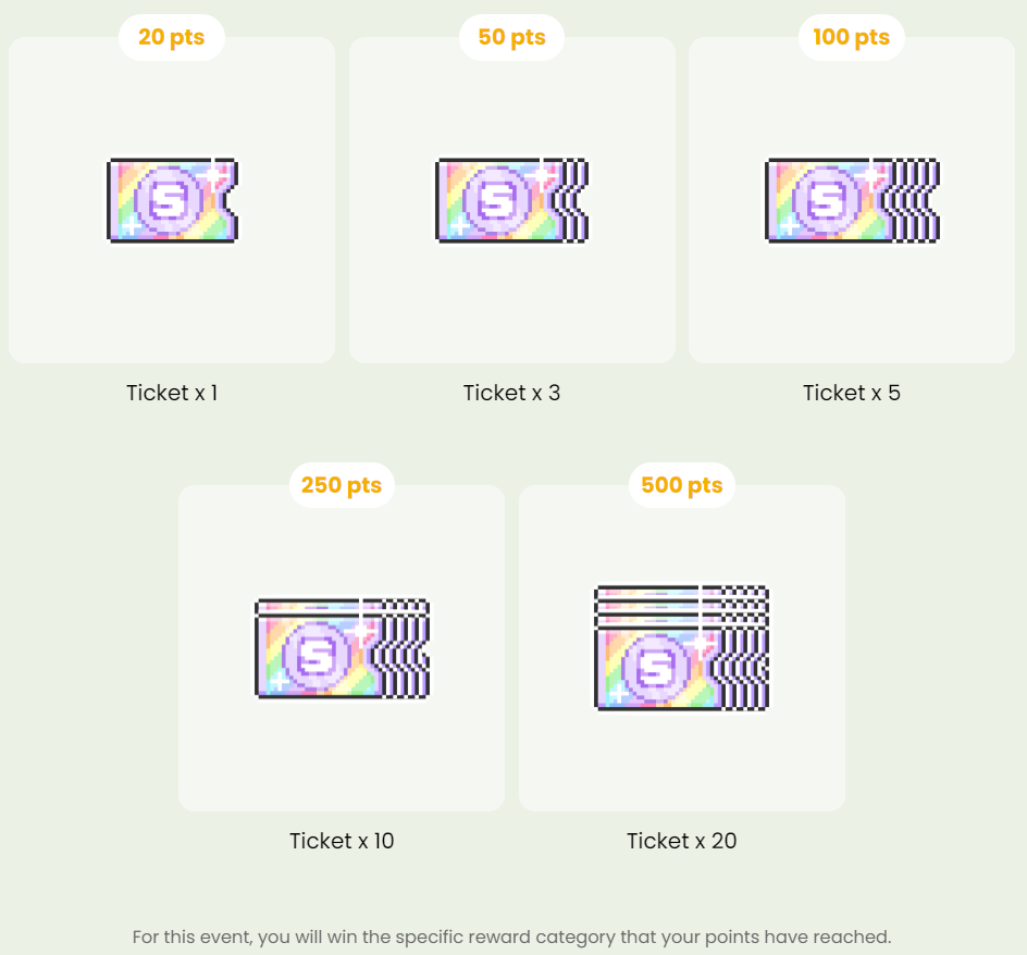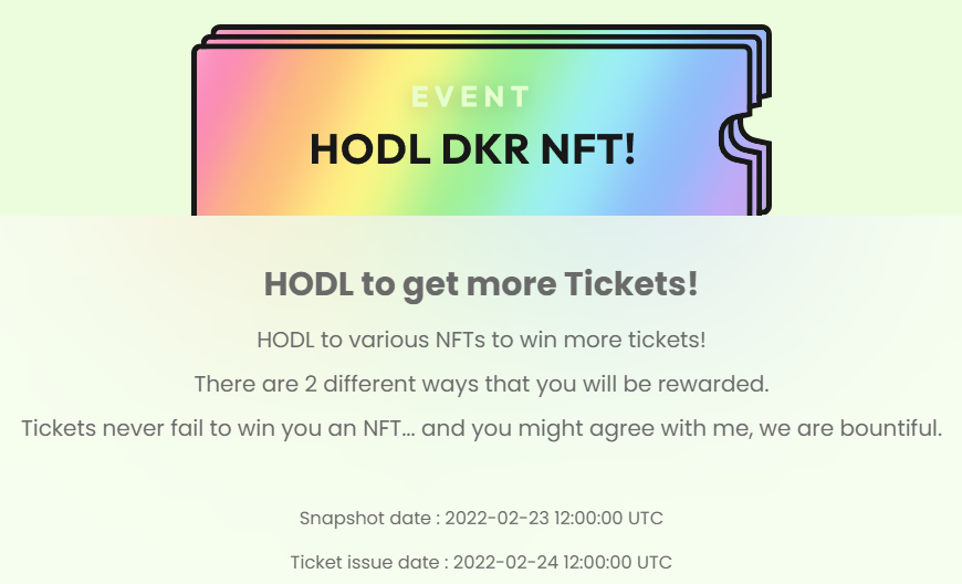 보유한 모든 NFT 점수를 합산해서 합산점수에 따라서 다음과 같이 DKR NFT를 획득할 수 있는 티켓을 줍니다. 지난번 레퍼럴 이벤트와 다르게 50점이라고 50점 상품+20점 상품을 모조리 주지 않고 딱 50점에 해당하는 티켓만 준다고하네요. 99포인트여도 50포인트 상품인 티켓 3개만 주는 거에요. 티켓 4개가 아님.