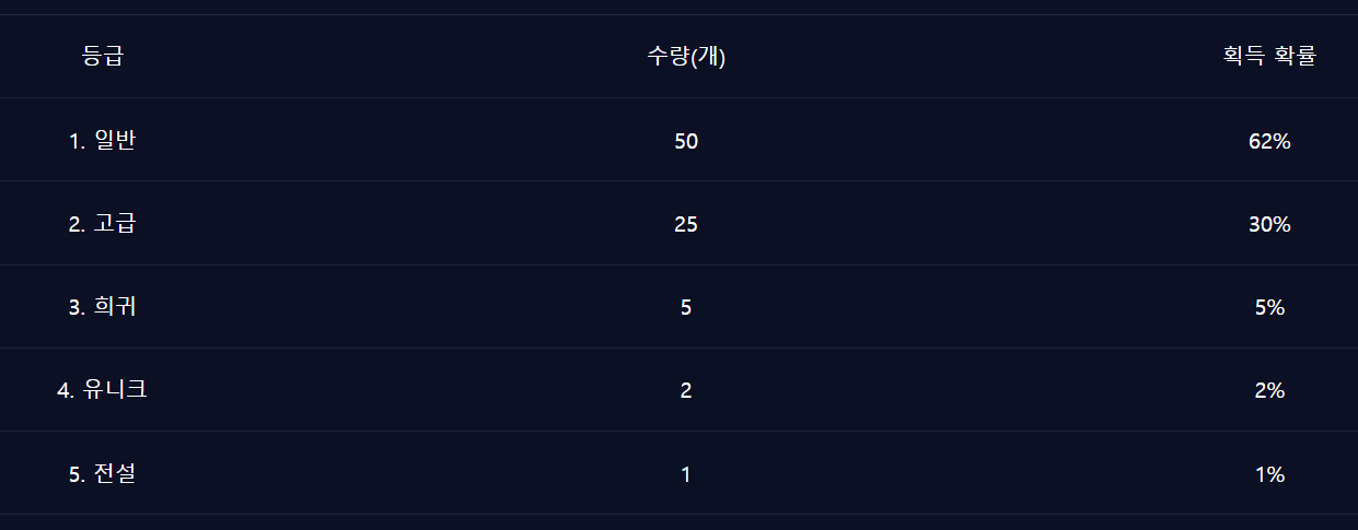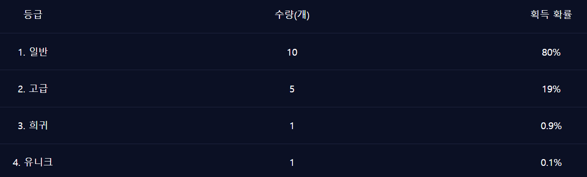 먼저 ODDS UP ITEM 1 PACK 은 일반 등급이 나온다고 할때 10개 줍니다.