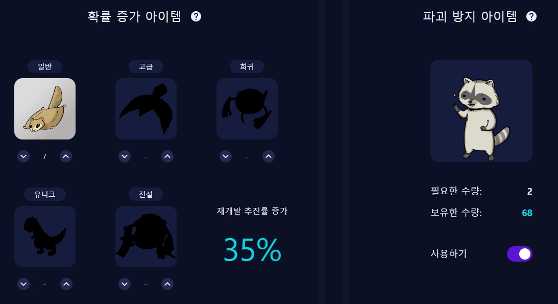 확률 증가 아이템을 안쓰고 16% 상태로 3번쯤 해봤는데 모두 실패했습니다. 다른분들 보니 13%로도 5~6번쯤 했더니 됐다는 분들도 있던데 저는 16인데 3번 실패하고 나니 제 똥손을 믿지 못하고 바로 확률보정에 들어갔습니다.