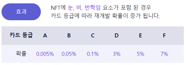 오옷! 아트배경에다가 희귀요소인 공룡이 붙었습니다!! E등급 카드이니까 4.5%의 추가 확률이 붙었네요. 만약 F 등급카드였다면 8%에 해당하는 재개발 성공 보너스 확률짜리입니다. 이런건 나중에 마켓플레이스 열려서 NFT 거래가 되면 같은 등급중에서도 더비싸게 팔릴거 같습니다.