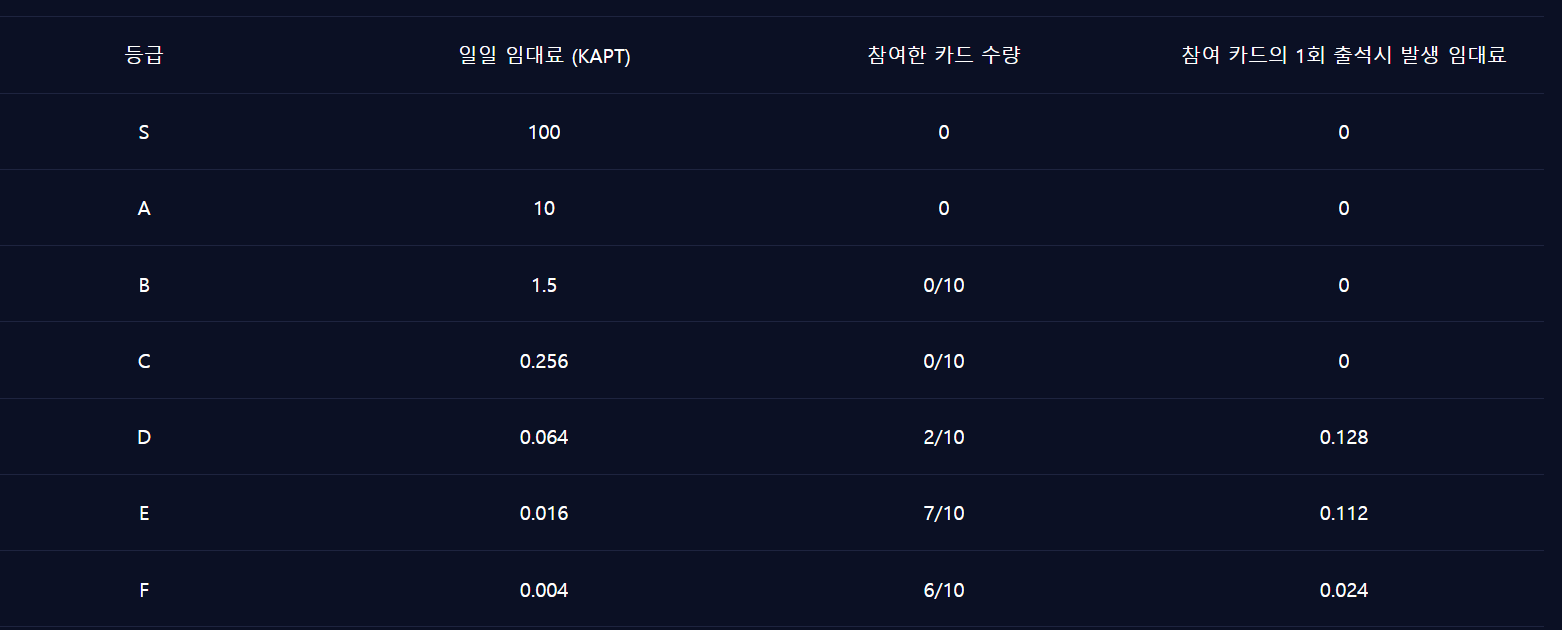 F 카드 1장의 일 임대수익은 0.004 KAPT이니까 1년간 모으면 1.46 KAPT (현시세 환산시 17,520원)가 됩니다.