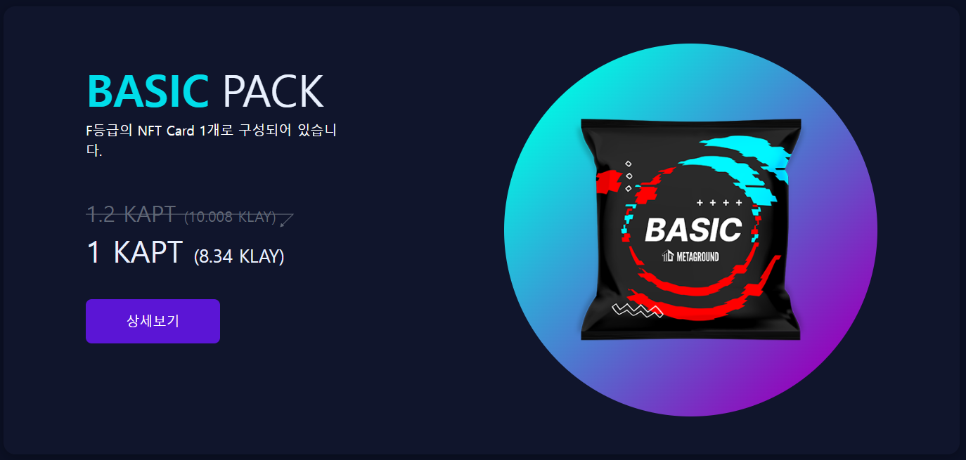 무료로 받은 1 kapt로는 현재 베이직 팩을 살 수 있습니다. 원래 1.2 KAPT이지만 정식오픈전 할인이벤트로 1KAPT입니다.