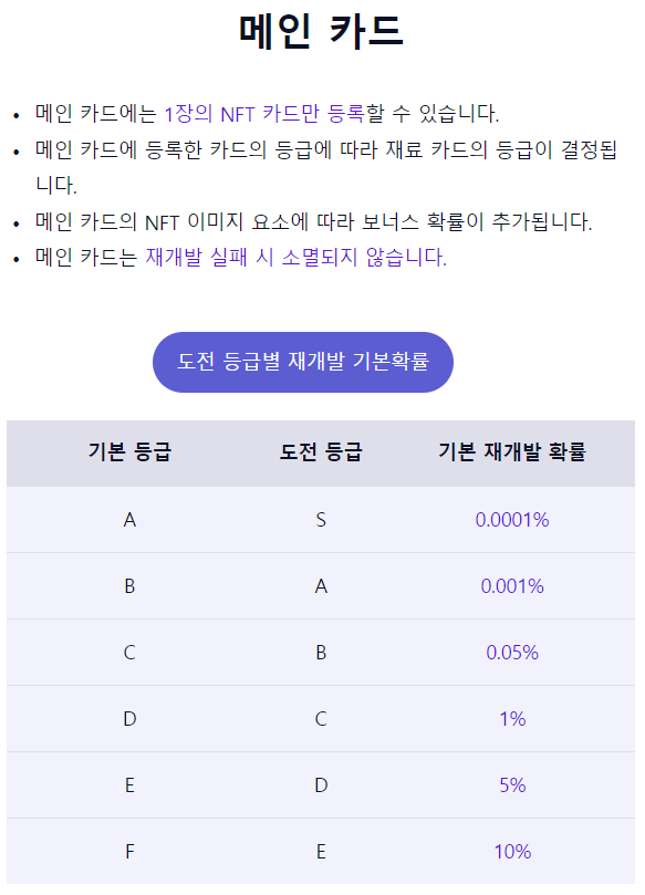 재개발이란 낮은 등급의 카드를 합성해서 상위등급 카드를 얻는건데 이게 부동산 NFT다 보니까 낮은 등급의 건물 여러개를 없애고 상위등급의 건물로 바꾸는 재개발이라고 표현했나 봅니다.