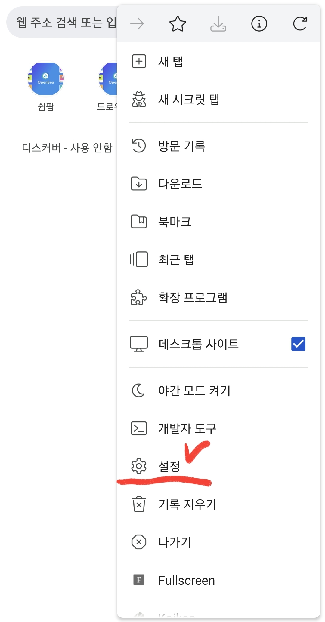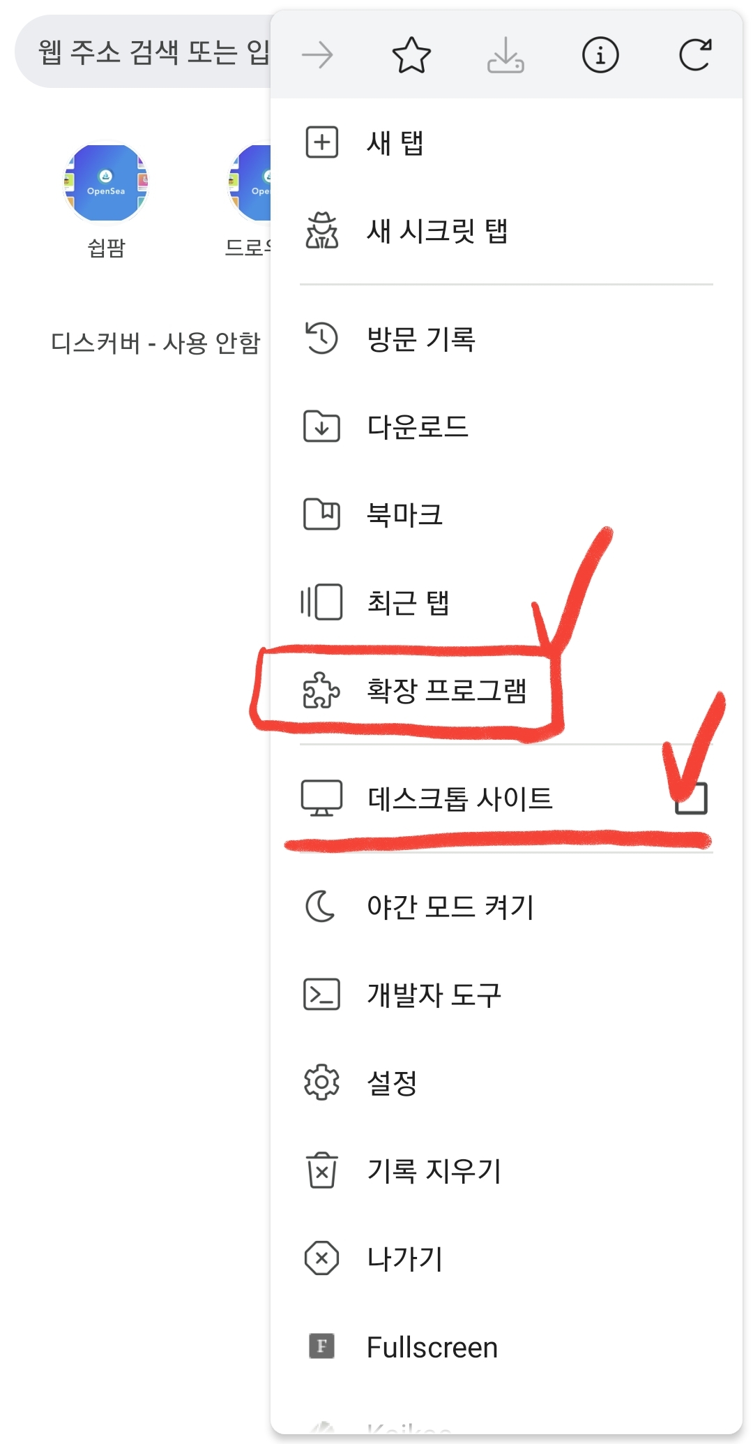 2) 키위브라우저를 켜고 우측 상단 점세개 아이콘을 누릅니다. 그러면 아래처럼 나오는데요. 데스크톱사이트에 체크하시고 확장프로그램을 선택해줍니다.