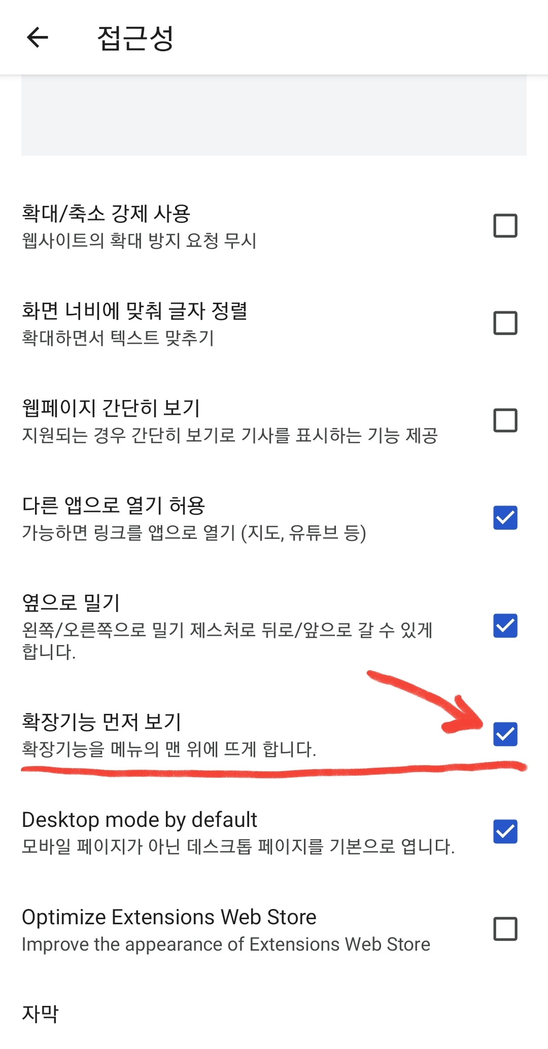 접근성 상세설정이 있는데요. 여기서 '확장기능 먼저보기'를 선택합니다.