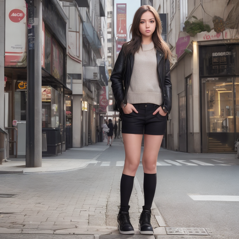:: 머리부터 발끝까지 다 보이도록 구도를 잡습니다. 종종 발목위부터 보이기도 합니다. 512 * 512 이미지 크기에서 full body로 구도를 잡으려하면 특별한 조치를 취하지 않고서는 얼굴이 뭉개져서 나오게 됩니다. 작은 크기의 이미지에 배경도, 사람도, 얼굴도 모두 세세하게 표현하기 어렵기 때문일거로 추정됩니다. 그래서 1024 * 1024로 이미지 크기를 키워서 생성했습니다.