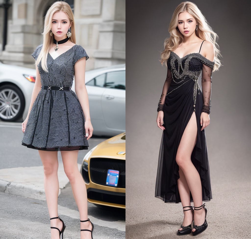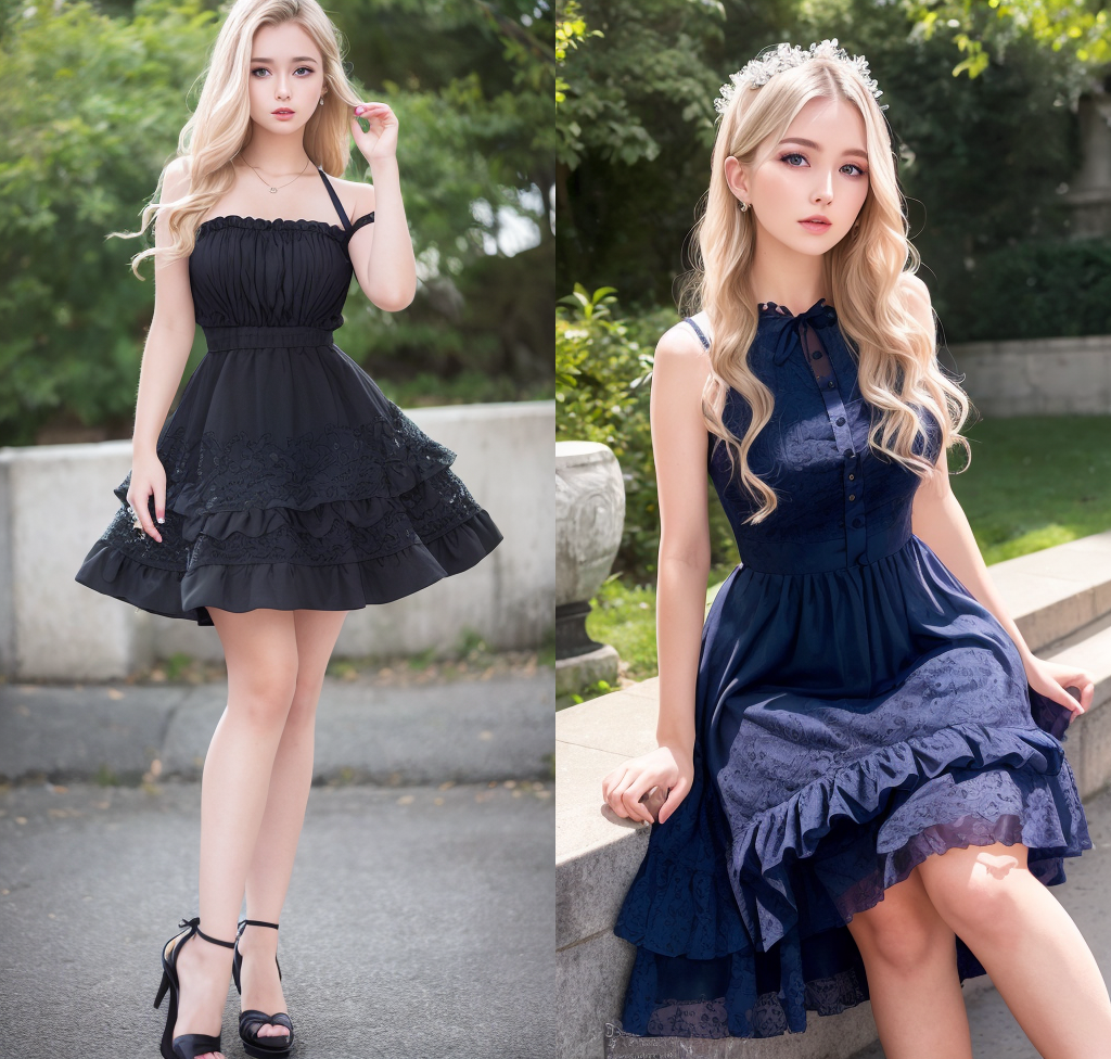 이번에는 의류 장식을 표현하는 프롬프트를 알려드립니다. 이번에도 역시 아래위 지정할 필요없는 드레스를 기본으로 깔고 갑니다. 공통으로 사용하는 프롬프트는 다음과 같습니다.