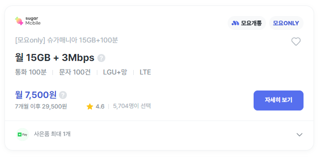 [sugarmobile] [모요only] 슈가매니아 15GB+100분 | 7,500원 | 모요, 모두의요금제